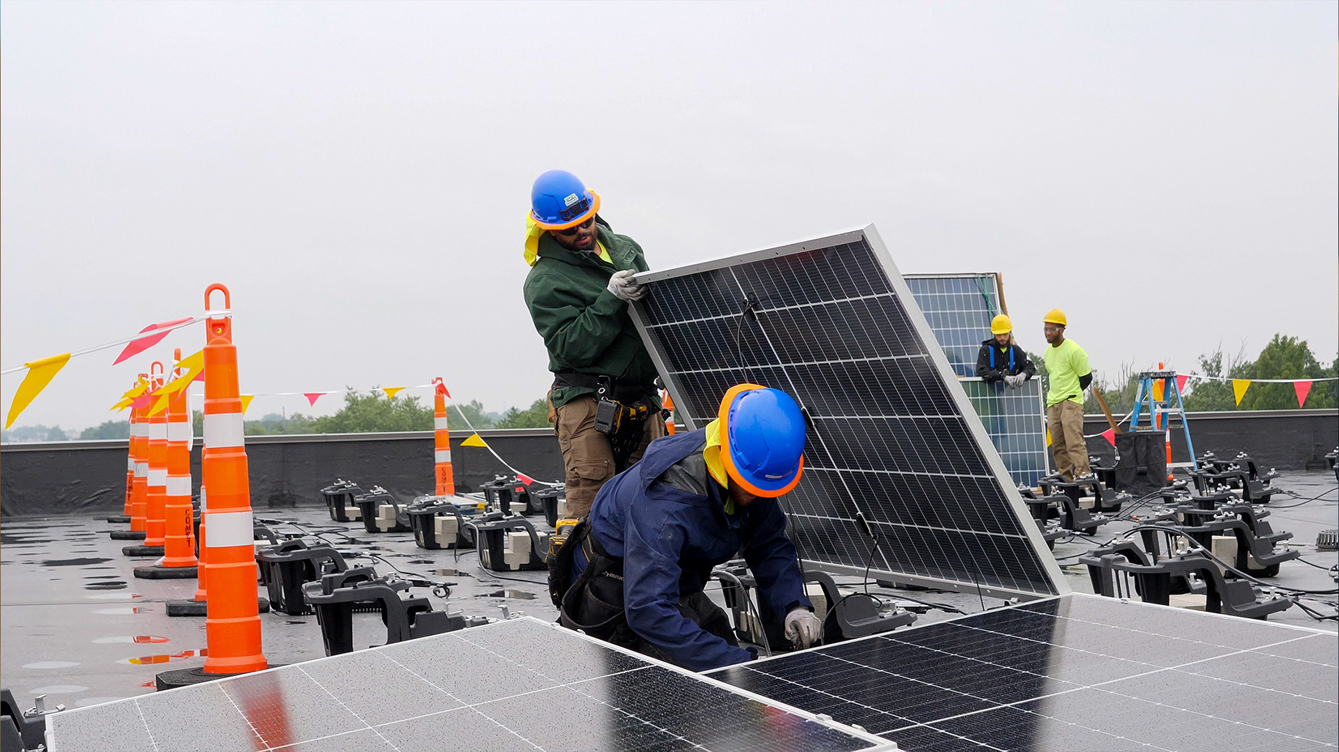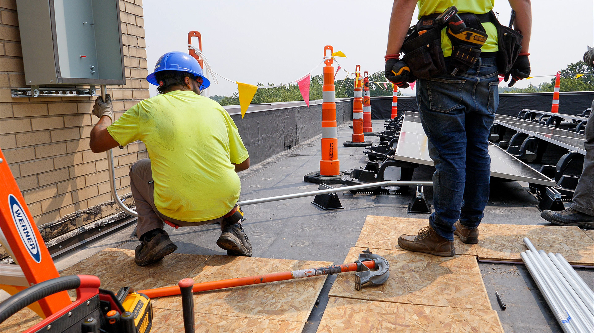 Installation begins with mounting system, whether floating or penetrated, depending on your roof style. It also includes electrical and conduit work, as the entire system is connected via a cable management system.